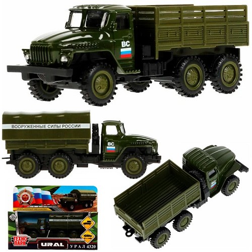 Машина Технопарк металл. УРАЛ-4320 Бортовой зелёный (12см) инерц.,съемный тент,в
