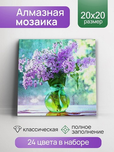 Алмазная мозаика класcика (20х20см) Свежая сирень с подрамником, полное заполнен