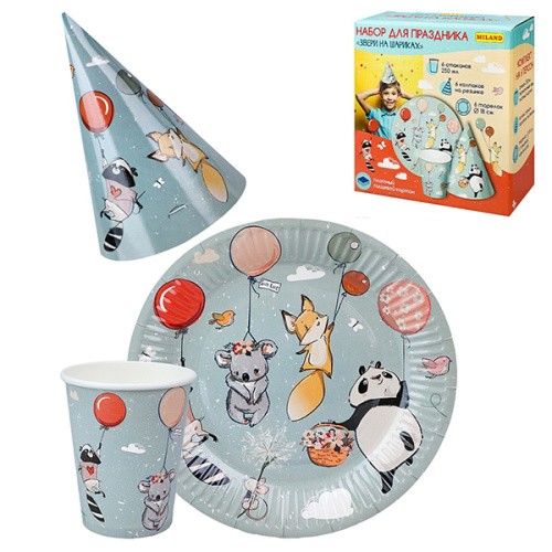 Набор для праздника Звери на шариках (тарелка 6 шт, стаканы 6 шт, колпаки 6 шт)