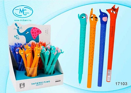 123066 - Ручка гелевая МС Basir "Животные" 17103 синяя,игол.након.,цв.корп.soft,прорез.на