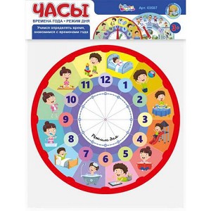 Поворачивайте стрелочки, устанавливайте их в разных сегментах циферблата – и развивайте представления ребенка о правильном распорядке дня и сезонном досуге. Учитесь определять время, выучите месяцы зимы, весны, лета и осени и весело проведите время за обучением! Вес: 114 г. Возраст: от 3-х лет