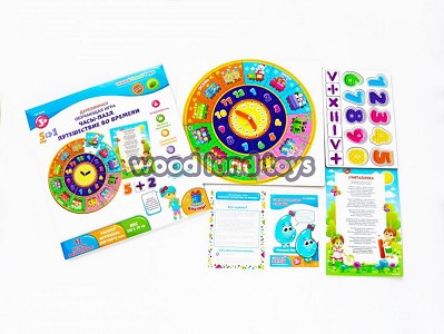 Пазл в виде циферблата ? обучающее пособие, которое знакомит ребёнка со временем, при этом тренирует навык счёта и учит распознавать части и целое. Набор включает в себя циферблат, состоящий из отдельных фигурных деталей и крутящихся стрелок. Задача ребёнка ? соединить детали между собой так, чтобы все цифры и вагончики с животными были расположены в правильном порядке. Рассмотрите вместе с ребёнком устройство циферблата и наглядно продемонстрируйте, что означает перемещение каждой из стрелок. Обсудите, в чём заключается различие единиц времени (секунда, минута, час). Обращайте внимание малыша на то, что по периметру циферблата изображены главные цифры от 1 до 12 на большом круге, и цифры-подсказки от 13 до 24 ? во внутреннем круге, а также деления, каждое из которых обозначает увеличение на одну минуту. После знакомства с циферблатом, предложите ребёнку установить стрелки в соответствии с текущим временем ? нужный час и нужную минуту. Помимо наглядного изучения времени пазл тренирует усидчивость ребёнка, знакомит его с цифрами и счётом, актуализирует знания о временах года. Научите Вашего ребёнка ежедневно пользоваться данной игрой ? это поможет ему лучше ориентироваться во времени и эффективно им распоряжаться! По возрасту:от 3 до 5 лет Материал:Древесноволокнистая плита высокой плотности, пластмасса, металл Комплектность товара:Набор деталей часов - 25 шт.,набор цифр и знаков - 17 шт., считалочка-карточка с примером (двухстороняя), инструкция (методические рекомендации), вудлик-магнит, листовка про вудлика Размер изделия (длина*ширина*высота):249*249*3 мм Вес изделия:357 ± 15 г