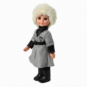 Рост куклы составляет 30 см. Волосы прошиты по всей головке, глаза вставные, закрывающиеся. Роспись лица выполнена вручную, присутствуют элементы нанесения аэрографом.