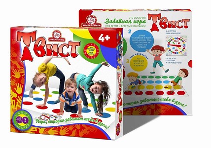 Цель игры: Крутите рулетку называйте часть тела и цвет, на который указывает стрелка. Все игроки должны ОДНОВРЕМЕННО переместить эту часть тела на кружок названного цвета. Держи равновесие и успей занять кружок, пока твой соперник не сделал это первым! Как победить? Кто последний устоял – тот и выиграл! Новые задания: «ВВЕРХ» – подними названную часть тела в воздух «ПРИДУМАЙ» — сам придумай задание. Нет идей – смотри оборотную сторону рулетки. 2 – 4 игрока либо командой Состав игры : Рулетка с заданиями Игровое поле с цветными кружками 4+