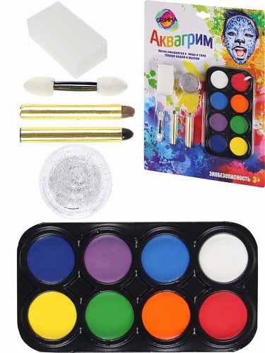 Набор аквагрима д/детей (8цв,карандаш-2шт,гель д/тела и лица,спонж,аппл) КС-3599