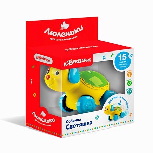 Эту милую собачку не просто так зовут Светяшкой! Она вся светится разноцветными огоньками – малышу нужно только нажать ладошкой на спинку игрушки. Собачка Светяшка – музыкальная: она поет 6 веселых песенок и мелодий («Песенка про ферму», «Стало солнышко теплей», «Топ-топ, топотушки», «Весёлая карусель» «Немецкая полька», «Чижик-пыжик»). А еще у собачки есть колесики, и ребенок сможет покатать ее.