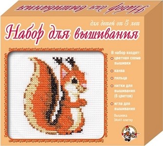 В набор для вышивания крестиком с пяльцами и иглой «Белка» входят: 1. Цветная схема вышивки. 2. Канва (размер 24,5х24,5 см). 3. Пяльцы. 4. Игла для вышивания. 5. Нитки для вышивания (мулине) 5 цветов. Набор для вышивания рекомендуется детям старше 5 лет.