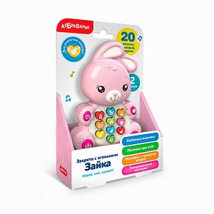 Малыш обязательно подружится с этим милым зайкой! Игрушку отличает разнообразное содержание: вместе с ней ребёнок будет петь любимые песенки и потешки («Пусть бегут неуклюже», «Весёлая карусель», «Добрый жук», «Антошка», «Два весёлых гуся», «Идёт коза рогатая»), танцевать под весёлые мелодии, слушать сказки(«Колобок», «Гуси-лебеди») и даже выучит счёт до пяти с обучающей песенкой! Таким образом, игрушка не только развлекает малыша, но и развивает его музыкальные и танцевальные способности, расширяет кругозор. Разноцветные кнопочки и рельефные элементы игрушки способствуют развитию тактильных ощущений. А весёлые огоньки, мигающие под музыку, создают ощущение праздника! По QR-коду внутри упаковки можно скачать интерактивную книгу «Первые знания» для смартфона или планшета. Возраст : 2-3 Размер товара: 10х13,5х3,3 см