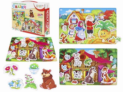 Развивающая и обучающая магнитная игра познакомит малыша с «Репкой» и «Теремком», двумя самыми известными русскими народными сказками. В этом ребёнку помогут магнитные фигурки - их можно крепить с одной из двух сторон на красочное игровое поле.