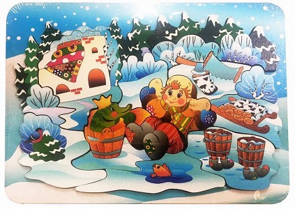 Деревянный пазл головоломка. В наборе фигурки персонажей сказки "Емеля", которые нужно расположить на поле. На входящем в набор вкладыше приведена картинка укладки фигурок. Сначала можно предложить ребенку собирать пазл по образцу, а затем по памяти. В ходе игры можно прочитать или сыграть с ребенком сказку по ролям. Возраст: от 3 лет.