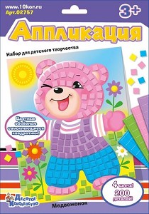 Дети, особенно девочки любят заниматься украшательством. Так они познают окружающий мир, учат цвета, постепенно приобщаются к творчеству. Детская аппликация веселый «Медвежонок» однозначно привлечет внимание малыша, а, чтобы она стала еще привлекательней придется приложить старание и усидчивость при наклейке квадратиков. Этот процесс превосходно разовьет моторику непослушных пальчиков и стимулирует творческие наклонности. Занятия рекомендуем проводить с детьми от 3 лет. Порядок работы: 1. Выбери квадратик по цвету. 2. Отдели квадратик от блока. 3. Приклей квадратик на картонную основу, на соответствующее его цвету место. Состав набора: - картонная основа (20х16 см) с напечатанным цветным рисунком – 1 шт; - самоклеящиеся квадратики (7х7х2 мм) 4 цвета – 200 шт.