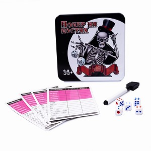 Испытай свою удачу! Покер на костях – это разновидность карточной игры, где вместо карт используют «кости» или игральные кубики. Цель игры – набрать как можно больше очков. Очки записываются в специальные карточки стирающимся маркером на водной основе. Это отличная игра для большой компании. Состав игры: Маркер на водной основе – 1 шт. Ламинированная карточка подсчета очков – 4 шт. Кости игральные (кубики) из полимерного материала – 5 шт. Правила игры записаны на внутренней стороне коробочки. Рекомендуется для детей старше 14 лет.