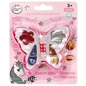 Набор косметики для девочек ТМ «Милая леди» непременно понравится маленькой моднице: - тени для век с блёстками 4-х цветов: синий, малиновый, серебряный, золотой - двусторонний аппликатор для нанесения макияжа - оригинальный футляр в виде бабочки - безопасно для детей - одобрено дерматологами
