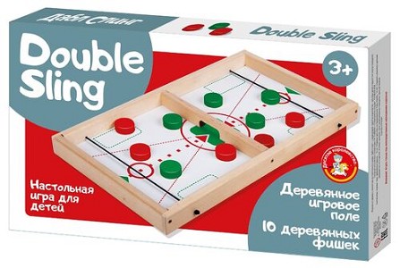Сразитесь с соперником в увлекательной активной настольной игре «Дабл Cлинг»! Состав игры: • игровое поле (43,3 х 25 см, высота – 33 мм) • деревянные фишки – 10 шт. (диаметр – 29 мм., высота – 12 мм) Цель игры – первым выбить все фишки своего цвета на сторону противника. Для этого необходимо натянуть фишку на резинку, прицелиться и отправить её прямо через центральные ворота на половину противника! Тот, кто сделает это быстрее, становится победителем игры.