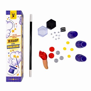 - 1 волшебная палочка - длина 33 см, - стаканчик - высота 7,5 см, - 8 кубиков - 0,8х0,8х0,8 см - напальчник (муляж пальца руки) с платком - длина напальчника 5,5 см - 3 стакана - высота 5 см - 4 шарика - диаметр 1,5 см - коробочка - диаметр 3 см - 3 монетки - диаметр 2,5 см