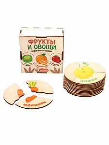 Деревянные пазлы для детей «Фрукты и овощи» (12 картинок) - интересная развивающая игра с элементами из древесного материала (экологичной березовой фанеры). На картинках изображены фрукты и овощи - ананас, морковь, свекла, помидор, лук, апельсин, груша, капуста, банан, яблоко, лимон, огурец. Края элементов закруглены и тщательно обработаны. Все материалы, использованные для изготовления данной игрушки, проверены и имеют сертификаты соответствия. Ознакомиться с сертификатом можно на страничке товара. Состав игры: - 12 пазлов из древесного материала из 3 элементов каждый Размер элемента 5х5х8,5 см. Диаметр собранного пазла 10 см, толщина всех элементов около 3 мм. Пазлы хранятся в деревянной коробочке размером 11х11х4,7 см. Игра предназначена для детей старше 3 лет.