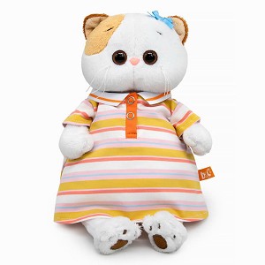 На Ли-Ли очень модное в этом сезоне платье поло. Платье сшито из качественного плотного х/б трикотажа в разноцветную полоску. Платье с чуть удлиненным рукавом, с отложным воротником из широкой трикотажной резинки и с застежкой спереди на планке. На ушке бантик в тон полоски на платье.