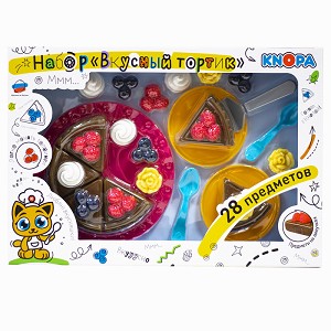 Прекрасный набор для ролевых игр, как дома, так и в детском саду. Все кусочки тортика имеют липучки, которыми крепятся между собой. Множество топпингов (тоже на липучках) позволяют собрать самые разные сочетания. В комплекте есть лопаточка, ложечки и блюдца, что в ходе игры приучает детей к правильной сервировке.
