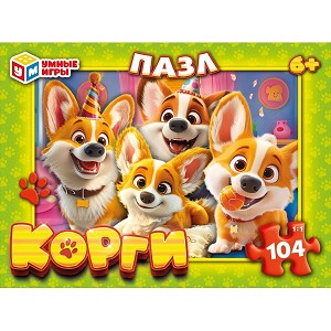 Классические пазлы в коробке «Корги» ТМ «Умные игры» – отличная развивающая игра для детей: - 104 детали - размер готовой картинки: 237 х 330 мм - яркие цвета - все элементы хорошо и плотно соединяются друг с другом
