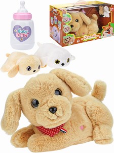 Комплектация: 1 бутылочка для кормления, 2 щенка. Материал: текстиль, пластик. В коробке с окном.