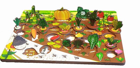 Деревянная доска "Овощи на грядке" - это игровая панель для развития мелкой моторики, внимания, усидчивости и воображения Вашего малыша, на которой расположен маленький настольный огород, где растут овощи и живут насекомые. Начнем собирать урожай. Какие овощи растут на поверхности? Попросите ребенка назвать их, достать из ячеек и установить в специальные пазы. Что такое корнеплоды? Почему они так называются? Какие корнеплоды спрятались под землей? Что такое ботва? Как выглядит ботва разных овощей? Для того, чтобы это узнать, предложите малышу совместить ботву с верхней частью корнеплода и потянуть вверх. Как называется овощ, расположенный под подставкой? Достаньте овощ из ячейки, обсудите, какого он цвета, какой формы, что из него можно приготовить, какие его части являются съедобными, а какие несъедобными? Кто живет в огороде? Попросите ребенка внимательно посмотреть и назвать, кого он видит на картинке. Крот, муравьи, жук, кузнечики, стрекоза, бабочка, гусеница, пчела, божьи коровки, червяки, колорадские жуки, - кто из них приносит пользу, а кто является вредителем?.