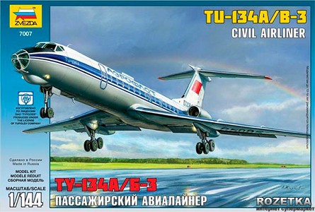 Сборная модель - Пассажирский авиалайнер Ту-134А/Б-3. Историческая справка: В 1970 году была разработана модификация Ту-134А. На ней установили более совершенные двигатели Д-30 второй серии с уменьшенным расходом топлива и реверсом тяги, сняли тормозной щиток. Число мест увеличили до 76 за счёт удлинения фюзеляжа на 2,1м. В 1980 году начался выпуск модификации Ту-134Б. На этой модификации вместо носовой кабины штурмана была установлена РЛС (радиолокационная система) «Гроза-134», что позволило совместить функции штурмана и второго пилота и сократить экипаж до 3 человек. Количество мест для пассажиров увеличилось до 80 человек. Набор деталей из пластмассы для сборки одной модели самолета. Модель собирается при помощи специального клея, выпускаемого предприятием «Звезда». Краски продаются отдельно от набора. Состав набора: отливки инструкция по сборке декаль Возраст 7+ Масштаб 1:144 Детали 58 Размер 28,5см