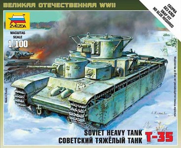 Сборная модель - Советский тяжелый танк Т-35. Историческая справка: Тяжёлый танк Т-35 разработан в 1932 году под руководством Николая Всеволодовича Барыкова. Танк имел 5 башен и весил 50 тон. Предназначался для прорыва линии обороны противника. Для начала 30х годов, танк имел не плохое вооружение, однако во второй половине 30х он очень сильно устарел. Противопульная броня не имела шансов против снаряда противотанковой пушки. Т-35 был символом советского строя и отлично выглядел на парадах, но в бою он никак себя не показал. Большинство машин было потеряно в первые дни войны в основном из-за поломок. Один Т-35 участвовал в битве за Москву. Тяжелый танк Т-35, машина, которая наводила ужас на немецких захватчиков, из-за огромных размеров и нескончаемого обстрела врага из пяти башен. Модель идеально собирается и готова пополнить коллекции моделистов и игроков. Сборка осуществляется без клея. Танк, с помощью игровой карточки, легко интегрируется в игровую систему Art of Tactic и позволяет игроку расширить свои игровые возможности. Использование танка в Art of Tactic: В игре Т-35, являясь тяжёлым танком, стоит 33 очка и имеет защиту «0». Танк предназначен для поддержки пехоты на поле боя, борьбы с лёгкой артиллерией и бронеавтомобилями. Единственным его плюсом является его класс – немецкая пехота не способна бороться с тяжёлыми танками. Защита «0» делает танк бесполезным для танковых дуэлей и прорыва. Набор деталей из пластмассы для сборки одной модели танка. Состав набора: 1 неокрашенный танк 1 флаг отряда инструкция по сборке Возраст: 10+ Масштаб: 1:100 Детали: 13шт Размер: 9.8см