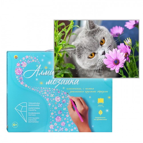 Алмаз.моз.класс.(17х22см) с подр,полн.зап. (20цв) Серый кот в цветах НД-0736