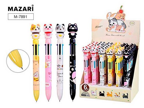 Ручка авт. шар. 6-ти цв. MAZARI "Кошечка" M-7891 пулевидн.,0,7мм цв.пласт.корп.,
