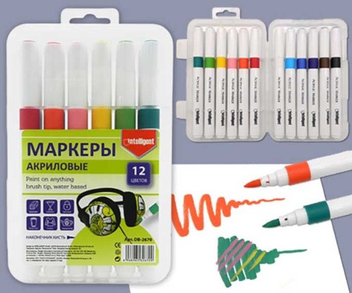Маркеры акрил. 12цв. INTELLIGENT DJ-254/DB-2670 кисть,1-4мм,пластик/к